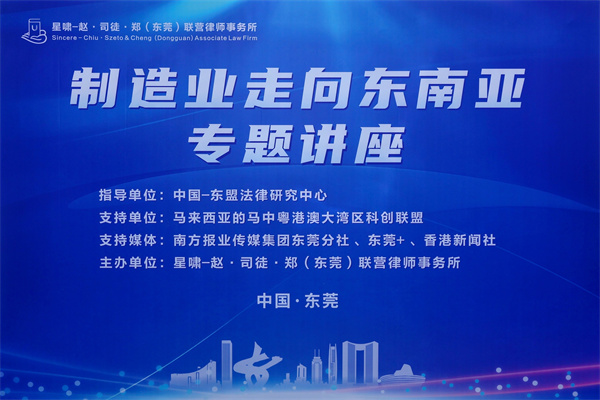 香港新闻社11月27日东莞电 26日,来自新加坡、马来西亚、越南、泰国、缅甸等国家的执业律师,在东莞南城举办专题讲座,就相关国家关于行业准入、公司注册、买地建厂、外汇管制、税务政策、人力资源等方面知识进行讲解和培训,让企业了解走向海外所需的全部流程和知识,帮助企业选择合适路径。马来西亚马中粤港澳大湾区科创联盟对讲座提供了支持!