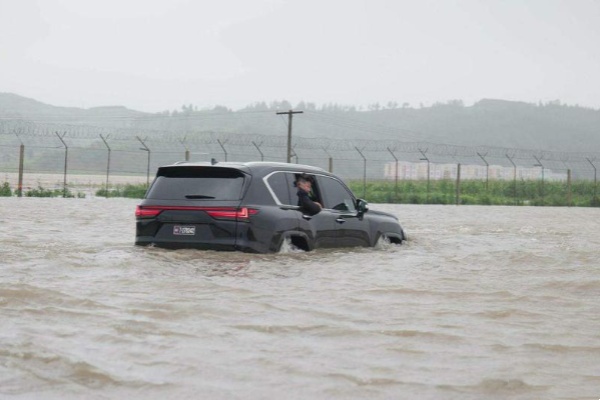 朝中社发布的照片显示,朝鲜领导人金正恩星期天到平安北道新义州市视察洪涝灾区,他乘坐的汽车在洪水中缓慢地前进。(法新社)