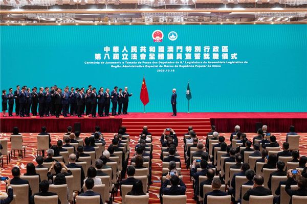 10月16日,在澳门特区行政长官岑浩辉(右一)监誓下,澳门特区第八届立法会议员宣誓就职。新华社发(张金加 摄)