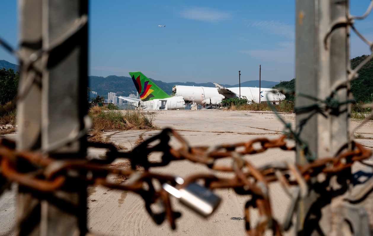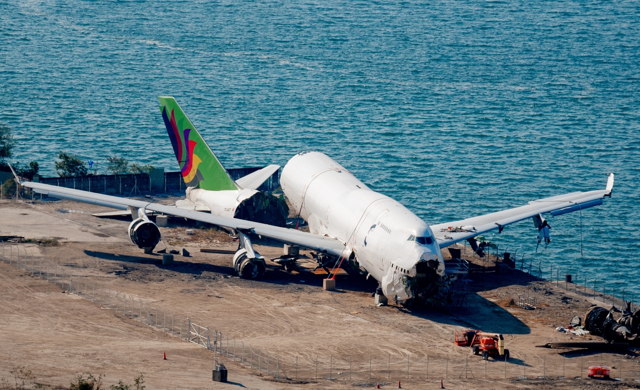 失事飞机残骸安置大屿山倒扣湾海仿,周边以铁丝网围封。