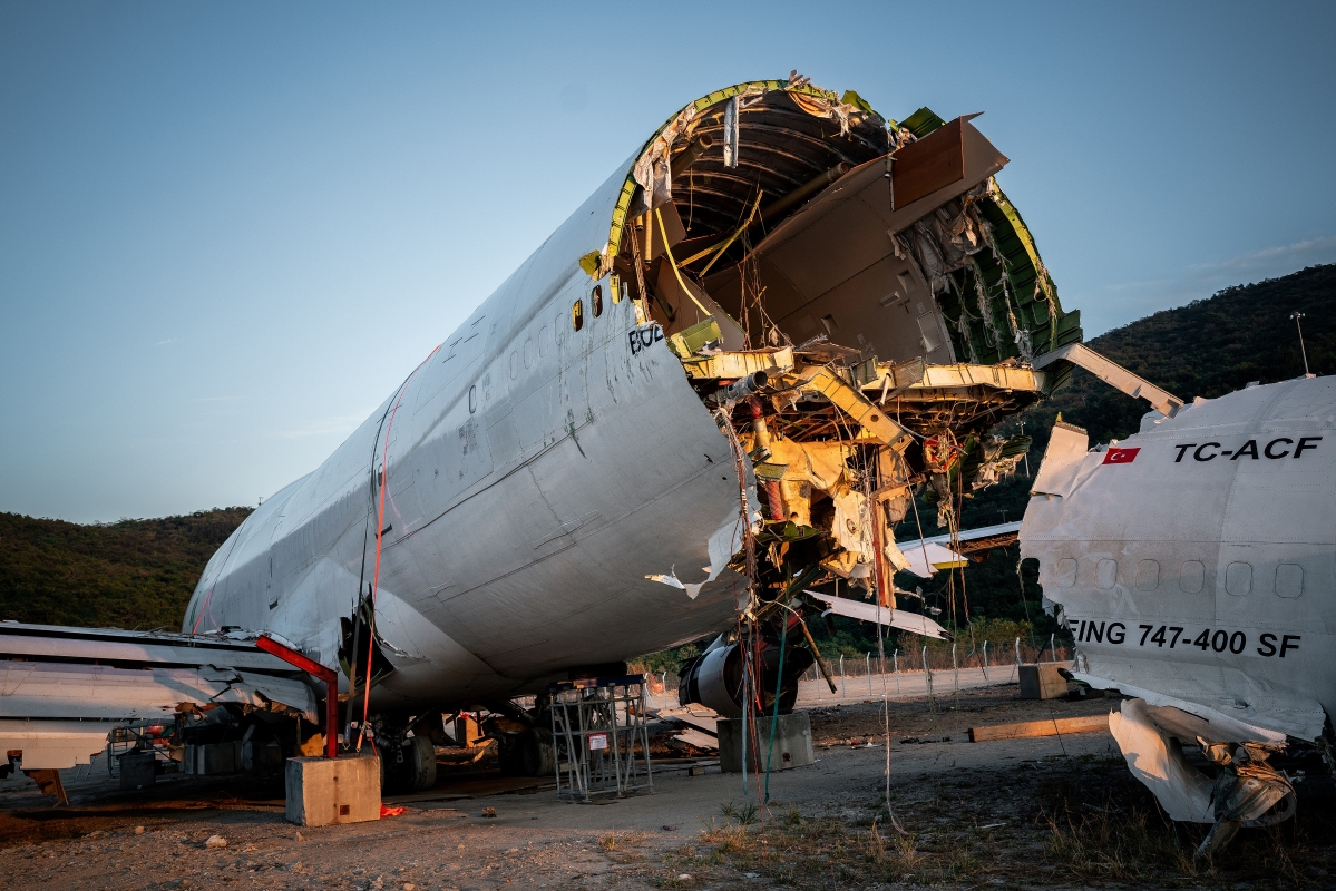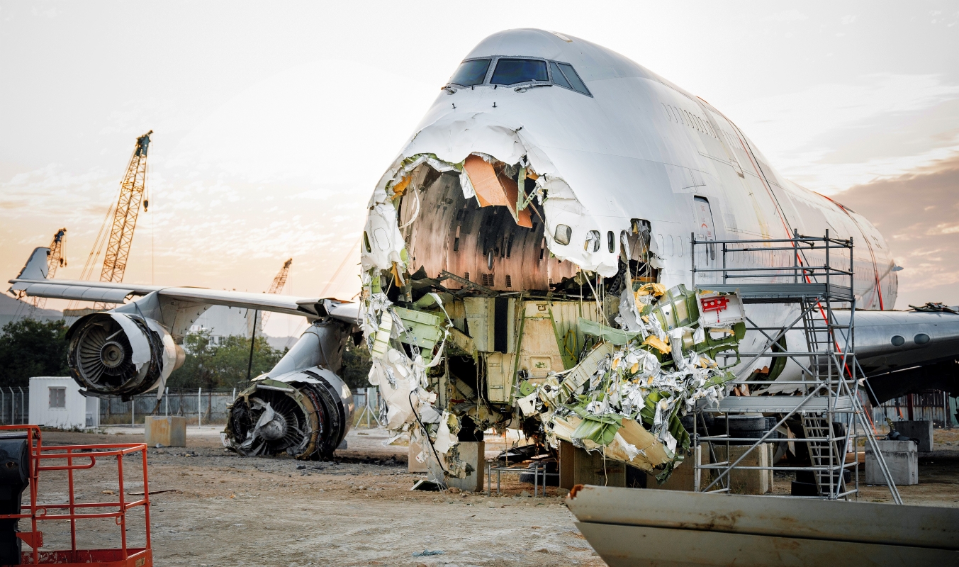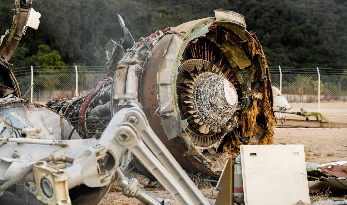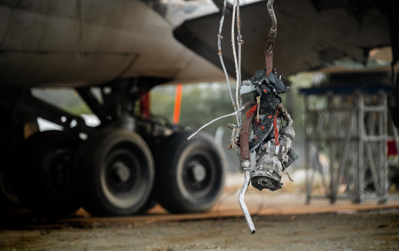 另一侧的地面散落着多件引擎部件,部分风扇叶片脱落,起落架轮胎被移到一旁,轮圈覆满泥尘。