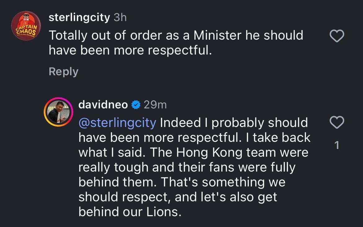 面对排山倒海的批评,梁振伟随即在一则批评他不够尊重人的留言下道歉:“的确,我也许应该更尊重对方。我收回我所说的话。香港队真的非常顽强,他们的球迷也完全支持他们。这是我们应该尊重的事情,同时也让我们继续支持我们的雄狮队。”