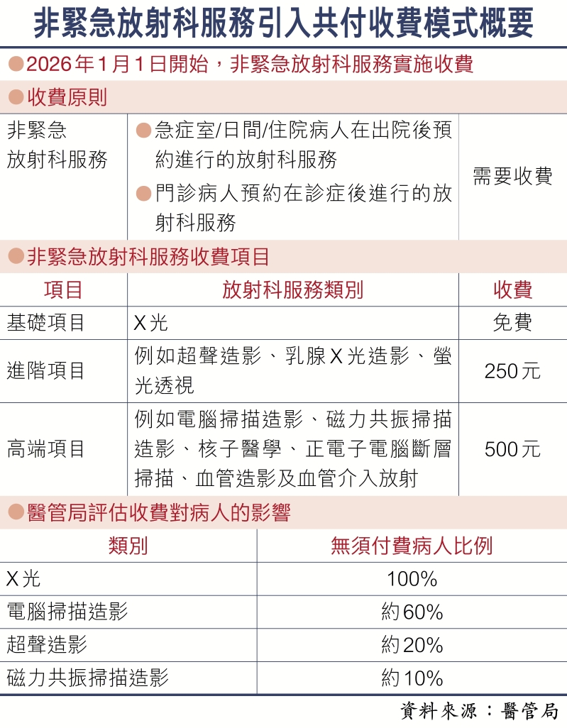 香港医院管理局的非紧急放射科服务,将于2026年1月1日引入共付收费模式,届时非住院病人接受非紧急的放射科服务均要缴付250元至500元港币(以下均为港币)不等的费用,并须在预约日期前最少14天预缴费用,过期未缴费将取消预约。香港医院管理局方面在2026年1月至3月对于此次收费设有过渡期,病人若有困难未能预缴费用,经说明可酌情安排接受相关服务。香港医管局解释,医疗资源有限,难以长期出现求过于供的情况,为让医疗资源能更精准、更高效,更快速的让真正需要的病人使用到医疗资源,需要引入共付收费模式,但强调公院的放射科服务仍维持约90%的高额度资助。
