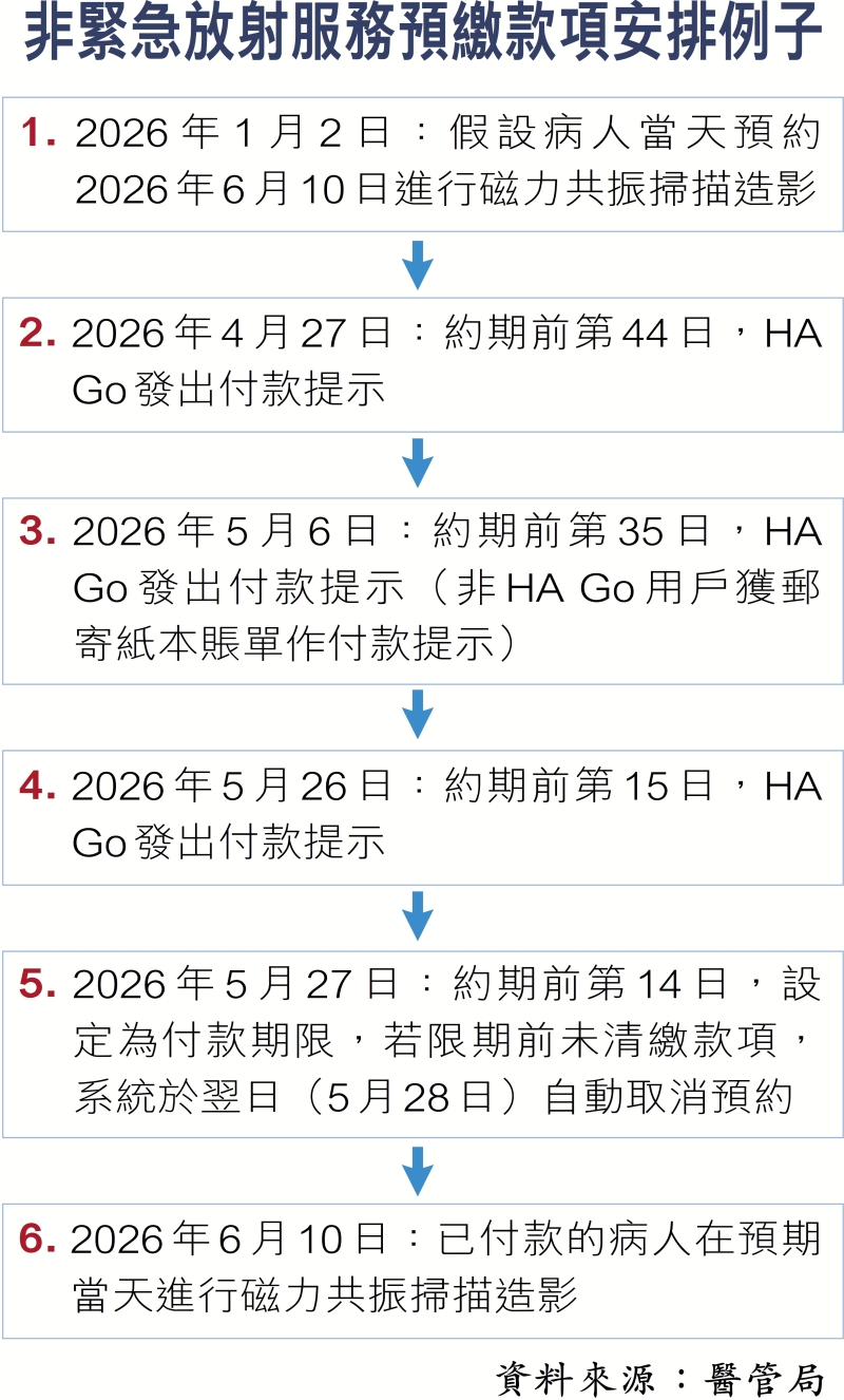 病人在预约接受放射科服务后,须于预约日期前最少14天完成付款,HA Go手机程式将在付款限期前发出最多三次付款提示,倘病人未于付款限期前清缴款项,系统将于翌日自动取消预约,放射科部门会将预约时段分配给其他病人。若需要重新预约,则先由相关医生根据临床情况评估是否需要重新转介申请放射科服务,放射科部门会进行新的预约排期。