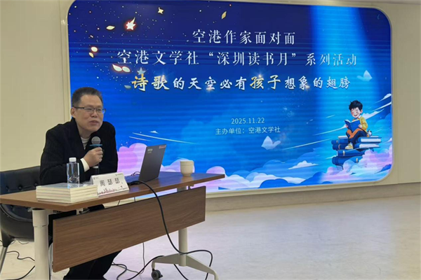 香港新闻社11月25日报道 深圳机场党建服务中心22日迎来了著名诗人、小说家、评论家周瑟瑟,他给空港文学爱好者带来了一场以《诗歌的天空必有孩子想象的翅膀》主题的诗歌讲座。活动由青年作家沈璐容主持,周瑟瑟老师与现场观众展开了一场探寻诗歌与想象的奇妙之旅。