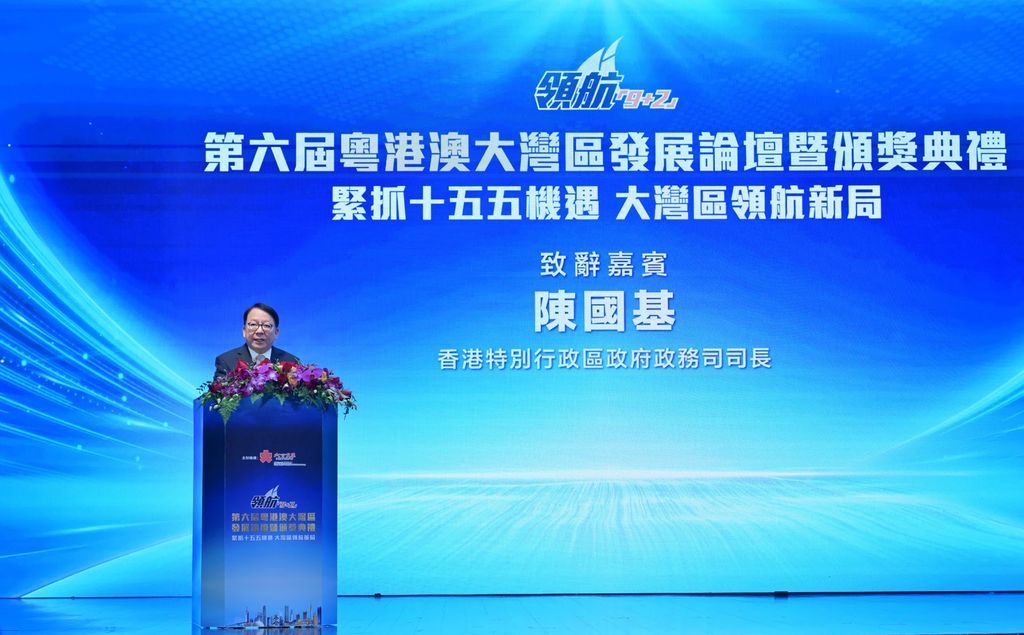 香港新闻社11月26日电 领航“9+2”·第六届粤港澳大湾区发展论坛暨颁奖典礼今日举行。政务司司长陈国基今日(26日)于典礼致辞时表示,粤港澳大湾区建设是重大国家发展战略,是香港融入国家发展的重点,也是本届政府全面推进的重大工作。