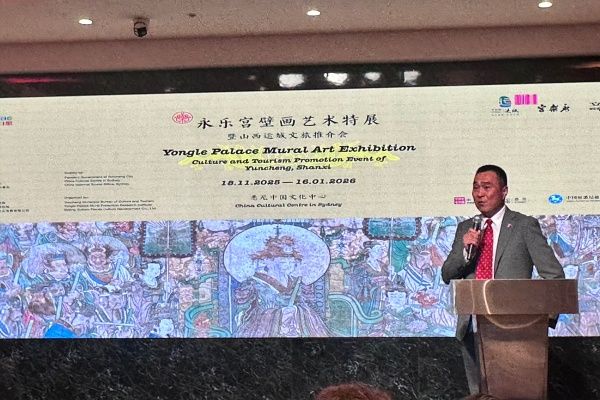 悉尼中国文化中心董事会秘书朱跃强现场推介了世界文化遗产——山西永乐宫赴悉尼巡展项目,向嘉宾介绍其历史价值与艺术成就,让现场观众感受到中华文明的深厚底蕴。