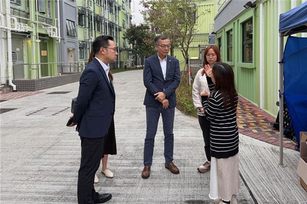 精神健康谘询委员会主席林正财医生(左二)和医务卫生局副秘书长李力纲(左一)昨日(十二月十日)到访九龙乐善堂位于大埔的「乐善村」过渡性房屋项目,实地了解大埔宏福苑火灾灾民在临时居所的生活环境、设施及支援。