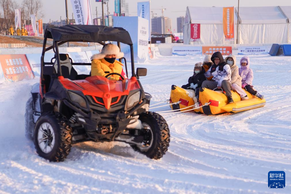 1月5日,游客在长春市肆季南河岸线公园体验“雪地香蕉船”游乐项目。