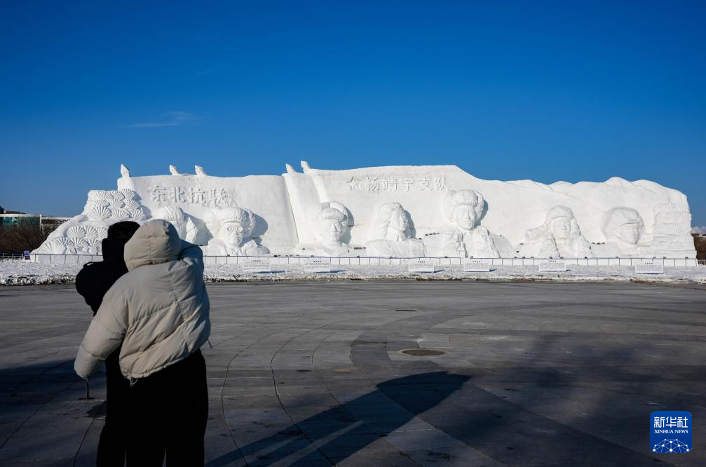 1月5日,游客在长春世界雕塑园观赏抗联主题雪雕。