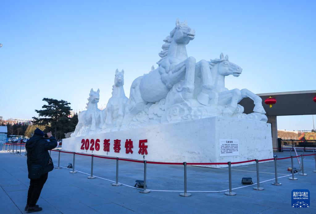 1月5日,游客在长春世界雕塑园观赏“马年”主题雪雕。
