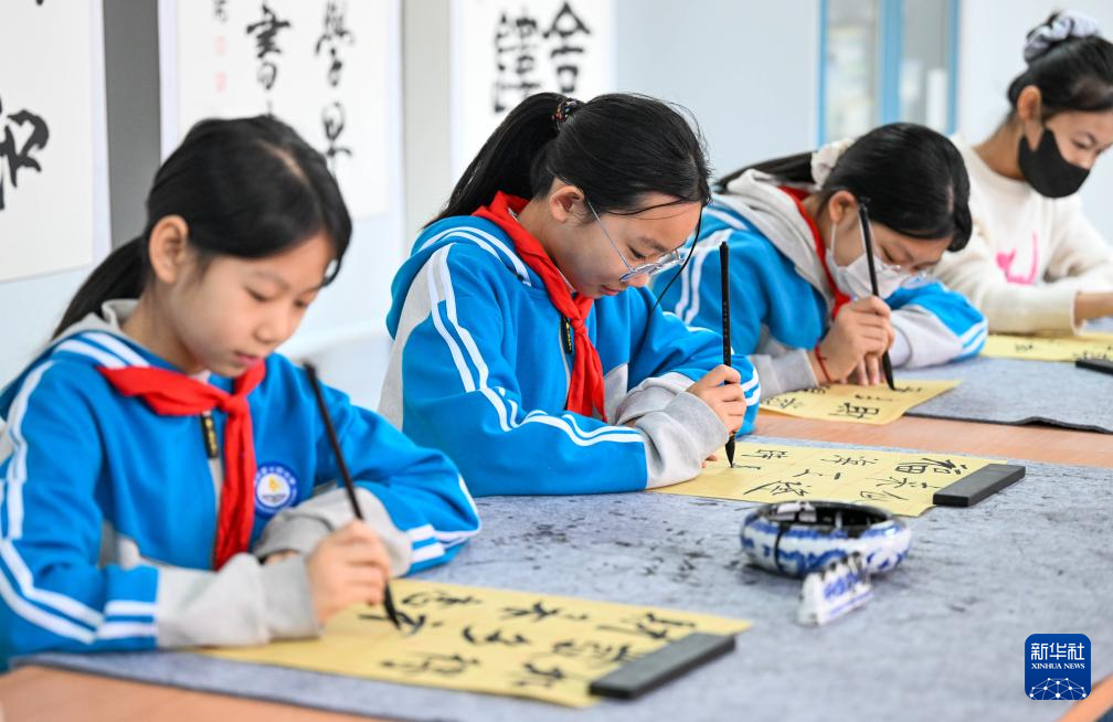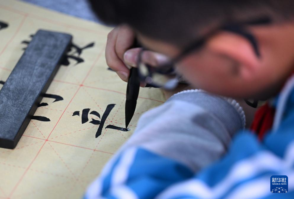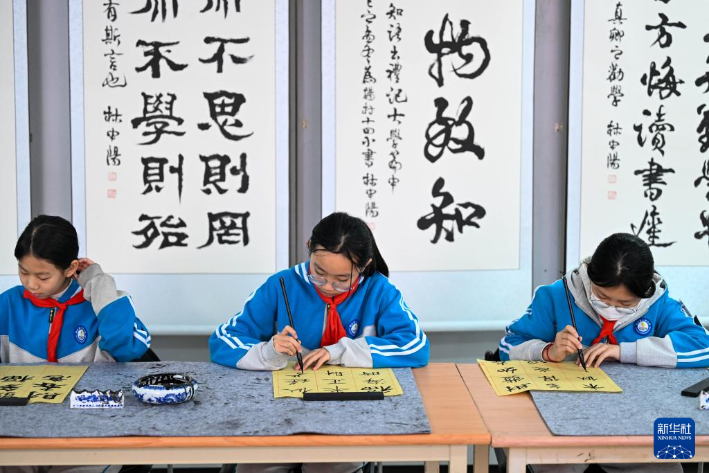 1月6日,在天津市武清区杨村第十四小学林中阳书法工作室,学生练习书法。