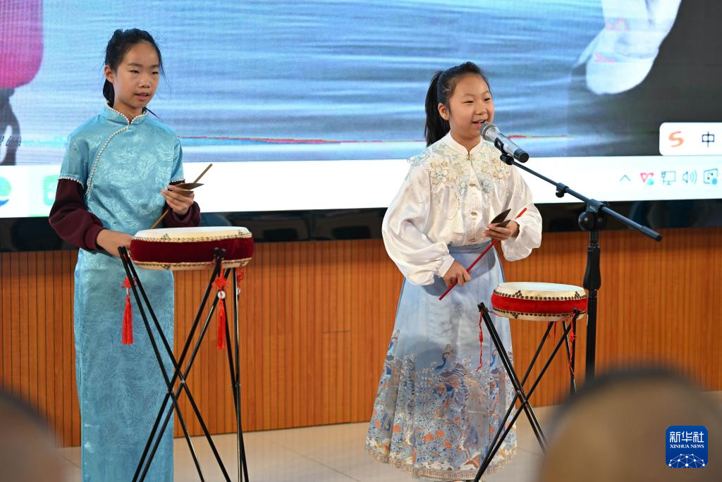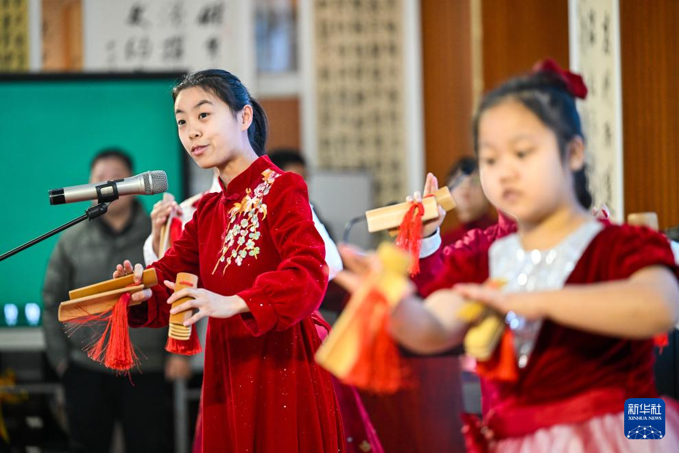 1月6日,天津市武清区杨村第十四小学学生在社团活动中表演京东大鼓。