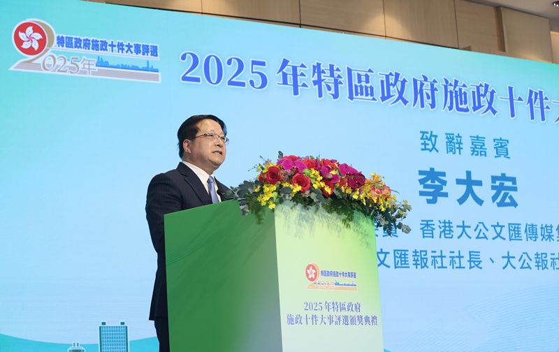 李大宏致辞表示,“2025特区政府施政十件大事”评选结果涵盖政治、经济、民生及大湾区融合等多个关键领域,充分映照出过去一年来,李家超带领特别行政区政府推动社会各项事业的发展:从第八届立法会换届选举圆满成功举行,到北部都会区建设破局提速推进;从粤港澳携手承办全运会与残特奥会、启动盛事经济,到宏福苑大火善后工作高效处置、厚植民生底色,特区政府展现出的良政善治新风貌、新作为,得到社会各界和广大市民的积极拥护与充分肯定。