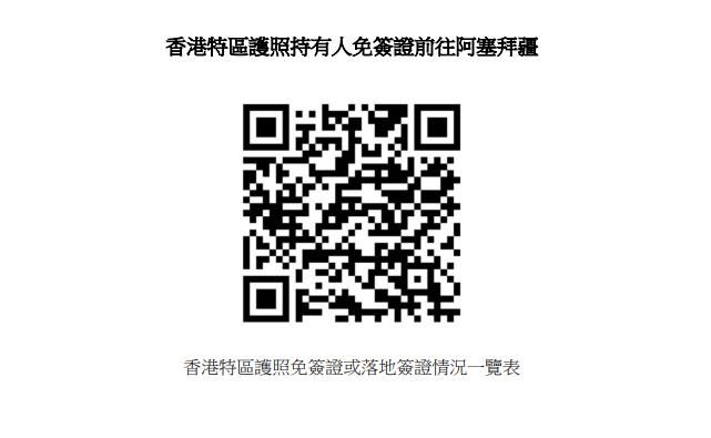 连同阿塞拜疆在内,已有共175个国家及地区给予香港特区护照持有人免签证或落地签证待遇。详情请浏览以下网页:www.immd.gov.hk/hkt/service/travel document/visa free access.html或扫描附件中的二维码(下图)。