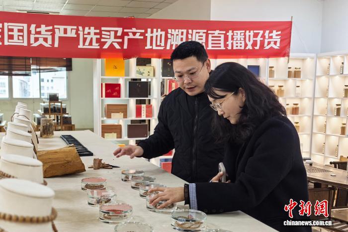 1月28日,兴全香业总经理洪仲森(左)介绍通过产业带溯源直播而畅销的香产品。中新社记者 孙虹 摄