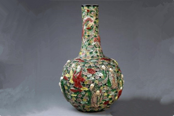 周建山说,瓶上所雕塑的十八罗汉,是指佛教传说中十八位永驻世间、护持正法的阿罗汉。他们神态悠然自得,衣纹随风飘扬,整个画面寓意和谐而美好,堪称清代晚期景德镇窑圆雕瓷器之杰作。
