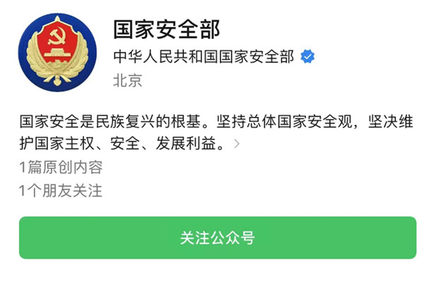 香港新闻社8月1日电 国家安全部开设微信公衆号,发表的首条内容是有关上月起实施的《国家反间谍法》,表示反间防谍需要全社会动员。