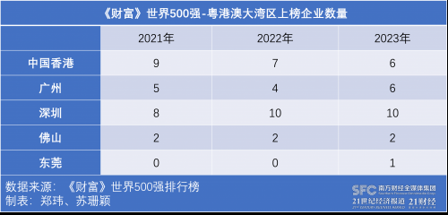 按照上榜企業註冊地統計,粵港澳大灣區共有25家企業上榜,佔上榜中國企業總數的17.6%。排名最前的企業是總部位於深圳的中國平安保險,位列第33位;第二是總部位於香港的中國華潤有限公司,排名第74位。地域分布方面,總部位於深圳的有10家,香港和廣州各6家,佛山2家,東莞1家。