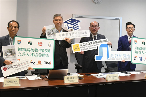 (左起)岭南大学潘苏通沪港经济政策研究所所长何泺生、香港高等教育评议会常务理事林森、立法会议员周文港、思路研究会研究总监王昊。