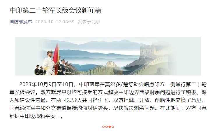 香港新聞社10月12日電 據“國防部發布”微信公眾號消息,2023年10月9日至10日,中印兩軍在莫爾多/楚舒勒會晤點印方一側舉行第二十輪軍長級會談。雙方就盡早以均可接受的方式解決中印邊界西段剩餘問題進行了積極、深入和建設性溝通。在兩國領導人共同指引下,雙方坦誠、開放、前瞻性地交換了意見,同意通過軍事和外交渠道保持溝通對話勢頭,盡快解決剩餘問題。在此期間,雙方同意維護中印邊境和平安寧。