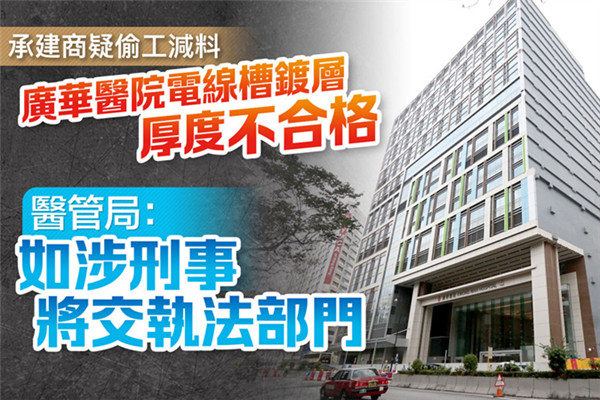 【点新闻报道】斥资逾100亿元重建、今年落成的广华医院新大楼,被揭发电线槽涉嫌偷工减料。医管局早前委托独立专家检测广华医院电线槽镀层厚度,局方今日(16日)证实,大楼电线槽镀层的厚度少于20微米(μm)的标准,重量亦未达275g/m2的相关标准,独立专家确认两者均不合规格,未达工程合约订明的标准。医管局已按照结果及合约条款向承建商采取跟进行动,同时局亦要求承建商详细调查及解释违规原因,若发现涉及刑事成分,会转交执法部门跟进调查。