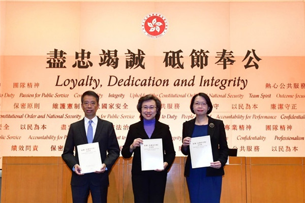 公务员事务局局长杨何蓓茵(中)13日主持记者会,公布更新《公务员守则》咨询稿。公务员事务局常任秘书长梁卓文及公务员事务局副秘书长张冯泳萍亦有出席。(香港商报记者 崔俊良摄)