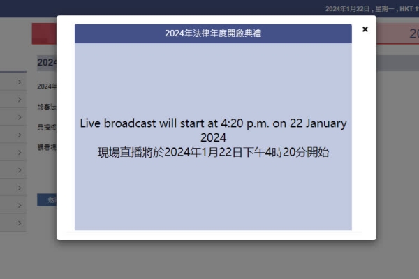 2024年法律年度开启典礼将于今日(22日)下午在香港大会堂举行。公众可于今日下午四时三十分透过司法机构网页观看现场直播。