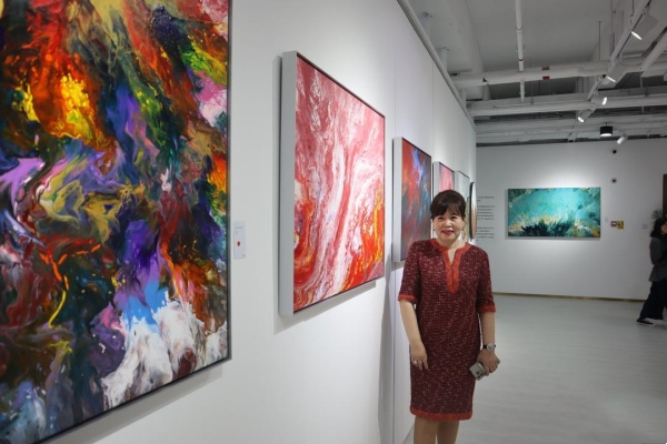 本次展覽共展出20多件Helen.Wan近年創作作品。這些作品以她多年來中西跨界生活為肌理,融合了中國傳統繪畫的人文意境和西方抽象表現主義的情感表達,將流體畫的自由表現與潑墨潑彩的隨機性相結合,畫面層次豐富,視覺效果獨特,情感表達細膩深邃,為觀眾帶來中西合璧、視野遼闊的獨特體驗。引起了現場許多知名藝術家及業內藏家的濃厚興趣,所展作品絕大部分被搶購一空。