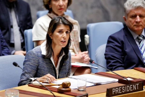 2018年9月5日,時任美國常駐聯合國代表妮基·黑利(左)在位於紐約的聯合國總部主持安理會會議。圖自新華社