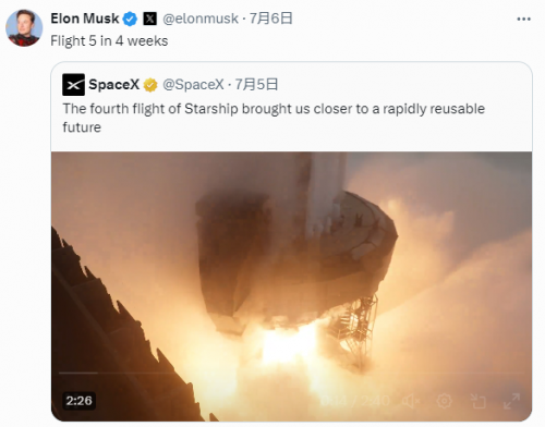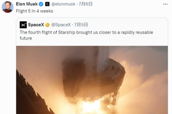 香港中通社7月7日电 美国太空探索技术公司创始人埃隆·马斯克5日在社交媒体X上表示,该公司新一代重型运载火箭“星舰”将在4周内进行第五次轨道试飞。