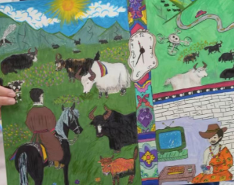 这是一幅有趣的画作:蓝天白云下,骑着马的孩子正在雪山下放牧,画面右侧,无人机追赶着牦牛群走向远方;藏族群众盘坐在家中,吃着糌粑、看着电视。