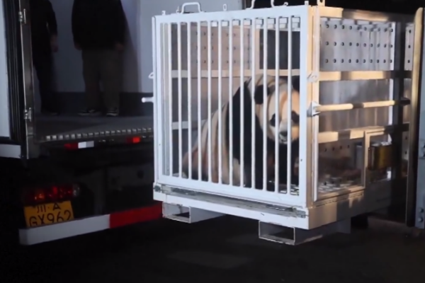 大熊猫“宝力”和“青宝”抵达美国华盛顿国家动物园。电视截图。