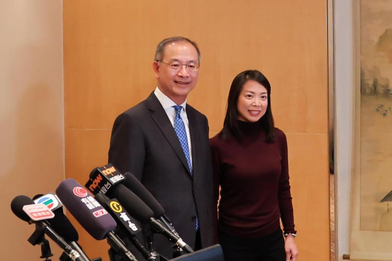 金管局总裁余伟文(左)与香港银行公会主席林慧虹(右)会见记者。