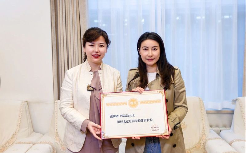 4月18日,郭晶晶(右)受聘为“北京景山学校体育校长”。图/北京景山学校