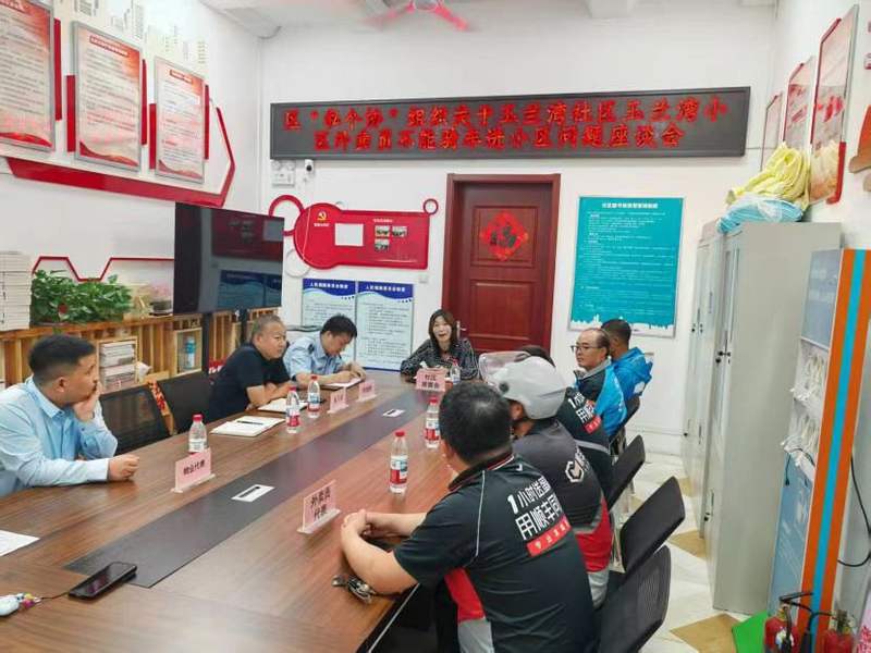 玉兰湾小区面积大、人口多,日均外卖配送量高达一千多单。为了居民安全,外卖骑手一直被禁止骑电动车进入小区,只能步行穿梭于楼栋之间。这项规定虽然保障了小区安全,却给骑手们带来了超时风险和体力负担。“我们也知道自己要赶时间送单,骑电动车普遍较快,存在一定的安全隐患,但徒步配送确实降低了送餐效率,一单超时不仅会影响后续订单,甚至我们还会被罚款200元,导致一天白干。”面对骑手反映集中的问题,来自社区居委会、物业公司以及区私营个体经济协会、九棵树市场监管所的相关负责同志结合社区工作实际,充分研究分析,努力寻求问题的解决办法。