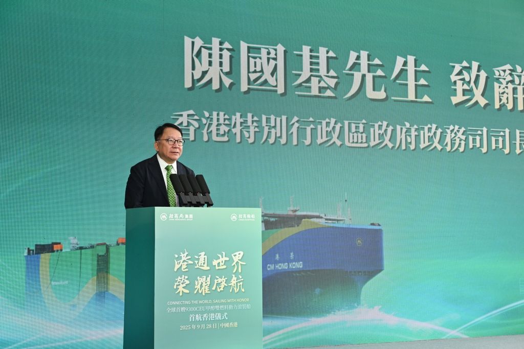 香港新闻社9月28日电 招商轮船全球首艘甲醇双燃料动力滚装船“CM HONG KONG港荣轮”今日(28日)举办首航香港仪式。政务司司长陈国基致辞时表示,“港荣”以香港命名,悬挂香港特别行政区区旗,以香港作为首航地点,对正在锐意发展绿色航运的香港,形容特别有意义。