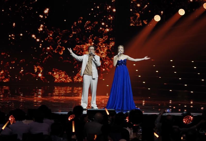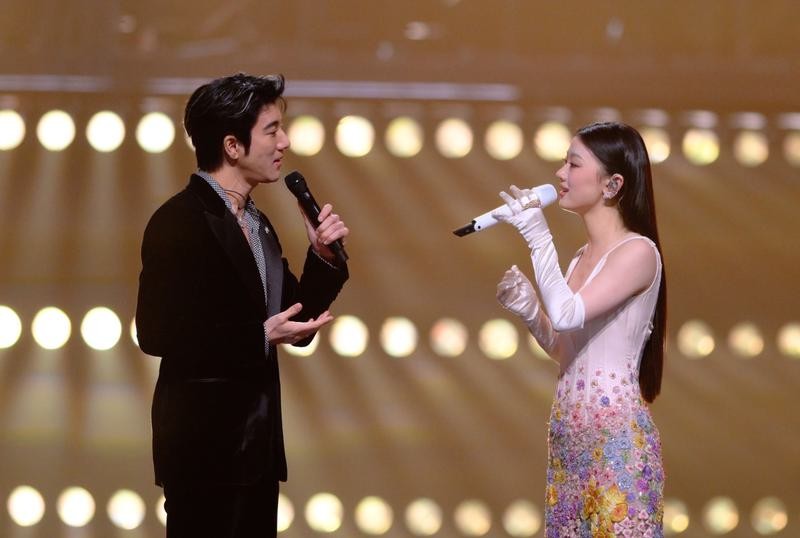 9月28日,王力宏(左)和单依纯在演唱《落叶归根》。图片来源:新华社