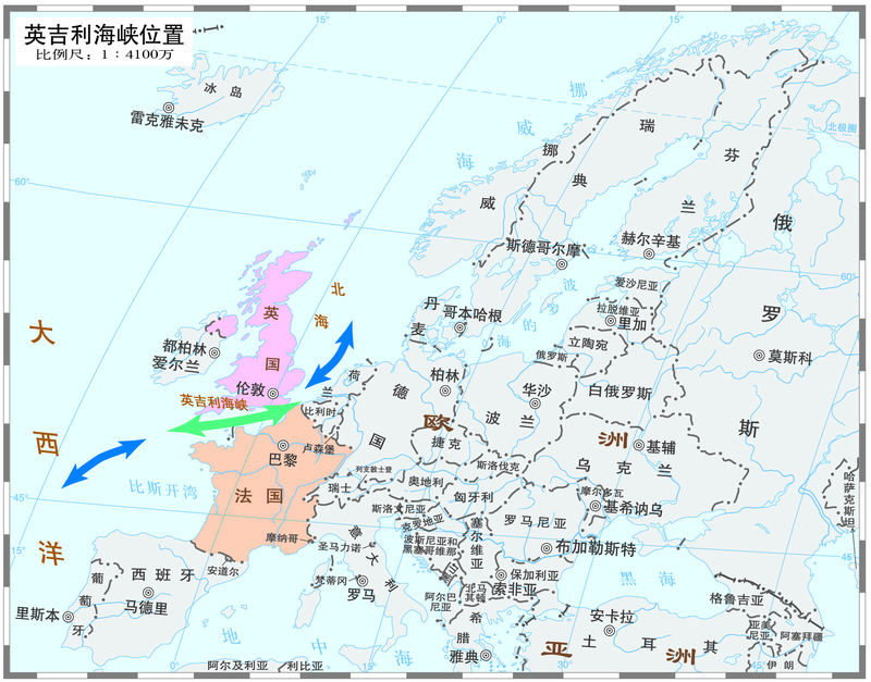 英吉利海峡位于北纬50度左右,与我国最北端的北极村漠河差不多,但这里却比我国的漠河温暖湿润很多。既没有严寒,也没有酷暑,冬季气温达到3.9~8.3℃,夏季只有19.4~21.4℃。这是因为英吉利海峡地处西风带,受北大西洋暖流影响,整体气候温暖湿润,气温比同纬度地区的海域温暖。这里终年多雨、雪和雾,年平均降水量635~1016毫米,年降水日逾百天,也就是说一年中有1/3的日期都有降雨或降雪。海流主要是北大西洋暖流。它自西进入,形成稳定的由西部的大西洋向东北部的海流,当有强烈的西风时,海流流速会达到1节以上。海峡两岸的潮汐现象明显,以半日潮为主。法国沿岸潮差大于英国沿岸。法国圣马洛湾平均大潮差最大可达11.9米,是世界海洋潮汐动力资源最丰富的地区之一。正是有这种得天独厚的资源,法国早在1966年就在圣马洛湾内的朗斯河口处建成了当时世界最大潮汐发电站,年可发电5.4亿度。