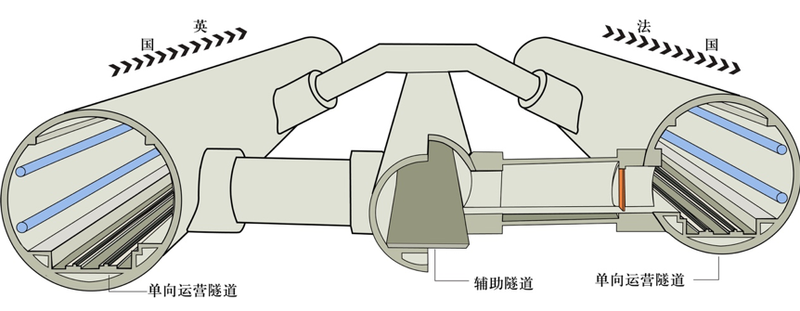 三条隧道南北平行排列,从海底40米深处的岩石中,贯穿整个海峡,南北两条隧道相距30米,是直径为7.6米单线单向的铁路隧道,中间隧道为辅助隧道,用于维修和救援工作,直径4.8米。隧道启用后,把伦敦至巴黎的陆上旅行时间缩短了一半,3小时即可到达。从伦敦飞到巴黎,航程一般需要3小时左右,如果把从市区到机场的时间算在内,乘飞机还不如乘穿过隧道的火车快。隧道的开通填补了欧洲铁路网中短缺的一环,大大方便了欧洲各大城市之间的来往,使英吉利海峡变为通途。