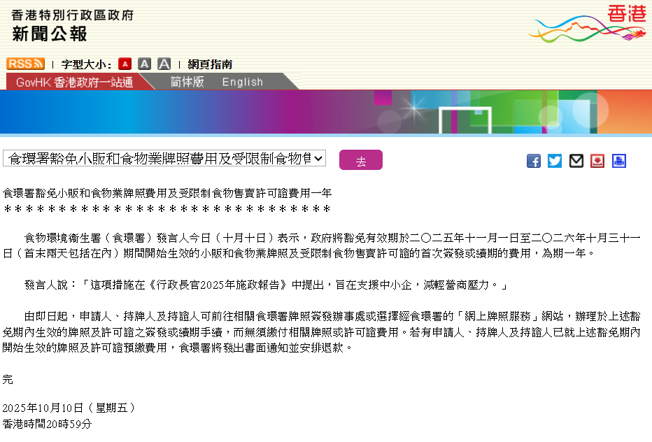 香港特区政府食物环境卫生署发言人10日表示,政府将豁免有效期于今年11月1日至明年10月31日(首末两天包括在内)期间开始生效的小贩和食物业牌照及受限制食物售卖许可证的首次签发或续期的费用,为期一年。
