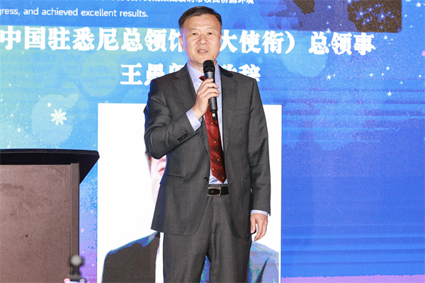 中华人民共和国驻悉尼大使衔总领事王愚在致辞中充分肯定澳洲中国东北同乡总会十五年来所取得的辉煌成就。他指出,十五年来,总会始终秉承爱国爱乡、团结互助、服务侨社的宗旨,已成为团结旅澳东北乡亲的重要平台,也是推动中澳民间交流与友谊的一座坚实桥梁。王愚总领事表示,澳洲中国东北同乡总会在弘扬中华文化、增进侨界凝聚力、促进中澳民间交流等方面成效显著,展现了东北人特有的坚韧、豪爽与担当精神。他勉励总会以十五周年为新起点,继续发扬优良传统,凝聚侨心侨力,汇聚发展合力,在推动中澳友好交流与社区建设中发挥更大作用,让“东北精神”在南半球的蓝天下继续闪耀光芒。