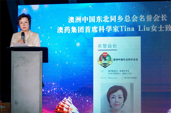 澳药集团首席科学家、总会名誉会长Tina Liu女士作为本次晚宴冠名赞助商代表致辞,感谢同乡总会一路以来的陪伴与信任,并表示将持续支持总会发展,“让企业的成长与社团的力量同频共振,为澳中交流注入更多正能量。”