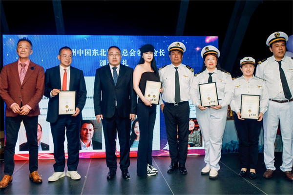 新增补的常务副会长刘达莎、姜冠企先生,副会长于芳女士、周建清先生、李涛先生、李瑞杰先生、孙晶女士、庞书林女士、孟莉女士上台、黑龙江同乡会(商会)副会长刘栩绯共同上台接受聘书。