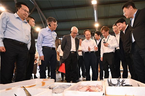 环境及生态局局长谢展寰(左四)和渔农自然护理署署长黎坚明(左三)陪同由国家农业农村部副部长张治礼(左五)率领的代表团参观鱼类统营处的香港仔鱼类批发市场,了解香港特别行政区渔产品的生产和批销情况。