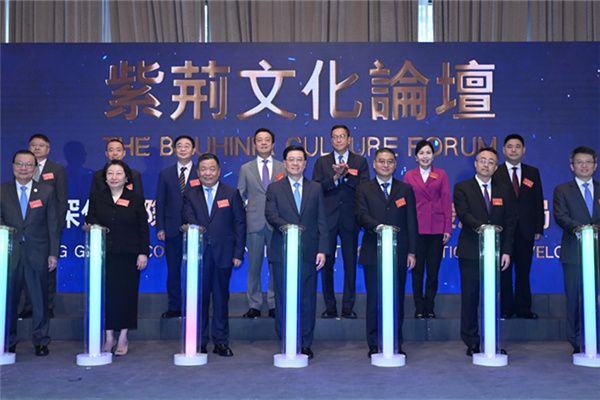 (前排左三起)紫荆文化集团董事长许正中、李家超、驻港特派员公署副特派员花有、港联办宣传文体部副部长李曙光等主持仪式。