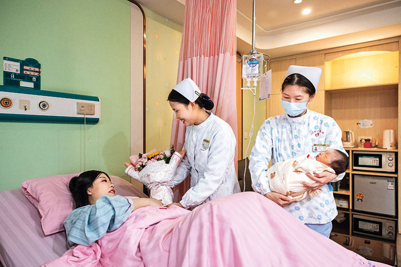 ▲资料图:年轻妈妈在医院分娩后,收到了鲜花。图/新华社