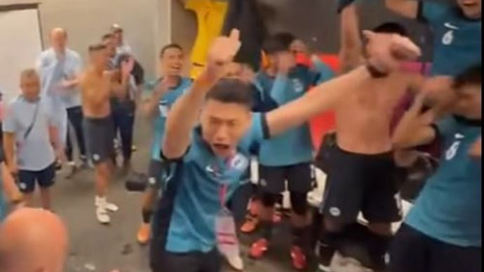 梁振伟(中)在更衣室得意忘形爆粗辱骂香港球迷和球员。影片截图