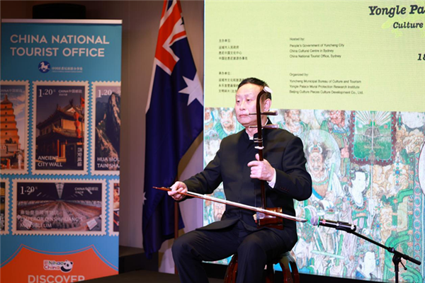开幕式上,二胡独奏《晋城往事》为嘉宾呈现了山西独特的地域风韵;《霓裳化壁》服饰表演则生动再现了永乐宫《朝元图》中元代壁画的神话意象与艺术风采,引领观众沉浸式感受古都运城的深厚文化底蕴以及永乐宫壁画的精神与美学魅力。本次展览将持续至2026年1月16日,设置“永乐宫历史沿革”“三清殿壁画”“〈朝元图〉复原展示”“数字艺术体验”等七大展区,通过数字影像、实物复制、艺术装置及非遗展示,全方位呈现永乐宫壁画的艺术成就与山西运城的丰厚文化内涵,为澳大利亚公众献上一场跨越时空的中华艺术之旅。