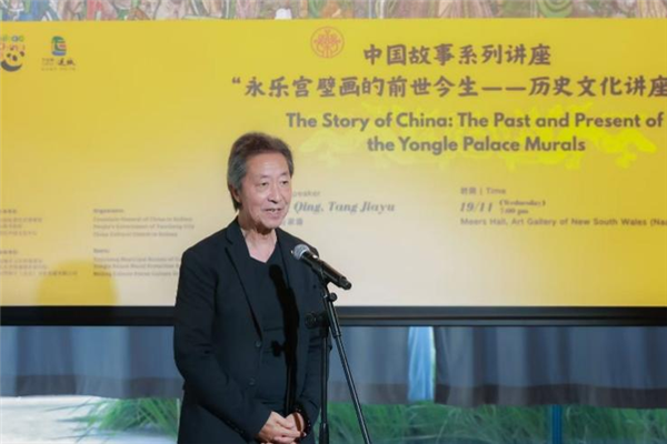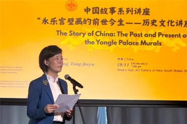 香港新闻社11月21日悉尼报道 中国故事系列讲座“永乐宫壁画的前世今生”19日在新南威尔士州艺术博物馆成功举办。讲座由中国驻悉尼总领馆、运城市人民政府和悉尼中国文化中心共同主办。中国驻悉尼总领馆文化参赞王书羽,运城市副市长张锐及政府代表团成员,悉尼中国文化中心副主任袁伟,澳大利亚新州多元文化事务署顾问委员会主席陈建青(Simon Chan AM),澳大利亚艺术家、文学家、汉学家、博物馆和美术馆工作者、高校师生以及相关领域学者200余人参加了本次讲座。